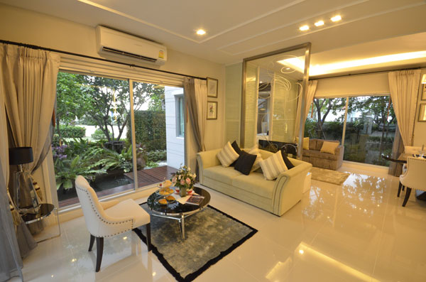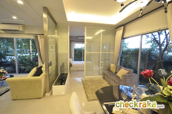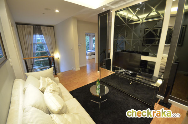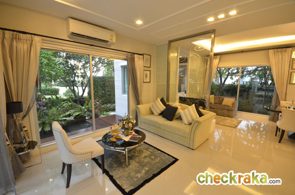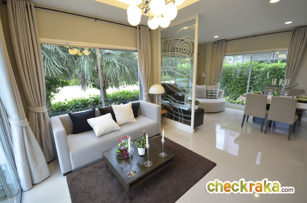 เข้ามาจะเจอกับห้องรับแขกแบบ Double Living พร้อมฉากใสกั้น ส่วนประตูบานเลื่อนที่มีโดยรอบทำให้ห้องดูโปร่งโล่งขึ้น