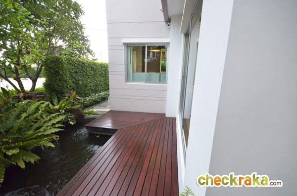ด้านข้างบ้านตรงนี้ทำเฉลียงออกมาและขุดบ่อปลา ดูเก๋และสบายตามากเลยค่ะ