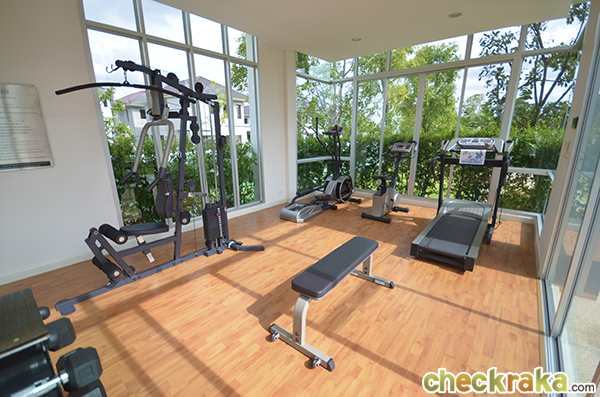 ฟิตเนสตั้งอยู่บริเวณริมสระว่ายน้ำ มีเครื่องออกกำลังกายครบครัน