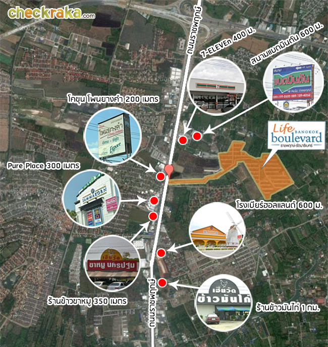สภาพแวดล้อมบนถนนราชพฤกษ์จะประกอบไปด้วยร้านค้าต่างๆ และร้านอาหารจำนวนมาก ตลอดถนนราชพฤกษ์ช่วงก่อนถึงถนนชัยพฤกษ์จะมีโครงการบ้านจัดสรรอยู่เป็นระยะๆ ดังนั้นร้านอาหารต่างๆ จึงเพิ่มจำนวนมากขึ้นเรื่อยๆ ค่ะ สำหรับสภาพแวดล้อมใกล้ๆ โครงการไลฟ์ บางกอก บูเลอวาร์ด ราชพฤกษ์-รัตนาธิเบศร์ นั้นก็จะมี Community Mall ที่อยู่ฝั่งตรงข้ามของโครงการ และถ้าหากออกจากโครงการแล้วไปทางขวาประมาณ 400 เมตร ก็จะมี 7-ELEVEN เราของมาดูแผนที่ด้านล่างนี้กันค่ะว่ารอบๆ โครงการนั้นมีอะไรที่เด่นๆ บ้าง