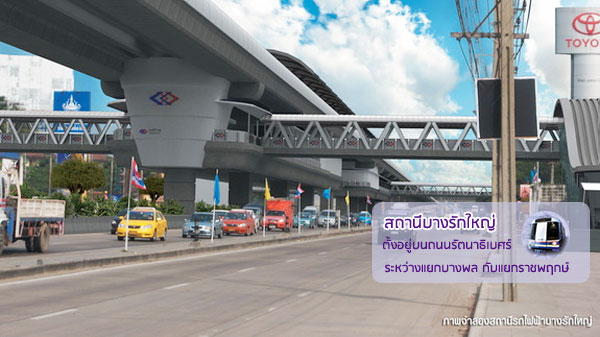โครงการรถไฟฟ้าสายสีม่วง ช่วงบางใหญ่-บางซื่อ มีระยะทางประมาณ 23 กิโลเมตร โดยจะก่อสร้างเป็นรถไฟฟ้าแบบยกระดับ (ลอยฟ้า) ตลอดทั้งสายมีสถานีจำนวน 16 สถานี โดยมีสถานีเตาปูนเป็นสถานีเปลี่ยนเส้นทาง (Interchange Station) ระหว่างสายสีม่วงและสายสีน้ำเงิน โดยสถานีที่ใกล้กับโครงการและสะดวกต่อการเดินทางมากที่สุดก็น่าจะเป็นสถานีบางรักใหญ่ (S05) ห่างจากโครงการประมาณ 9.5 กม. แต่สถานีนี้ไม่มีอาคารจอดรถนะคะ โดยมีกำหนดเปิดให้บริการประมาณปลายปี 2559 ซึ่งหากสร้างเสร็จแล้วคงช่วยลดปัญหาการจราจรติดขัดไปได้เยอะเลยทีเดียว