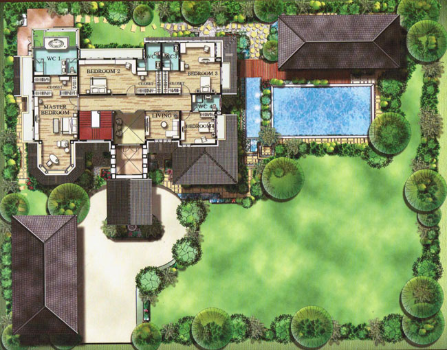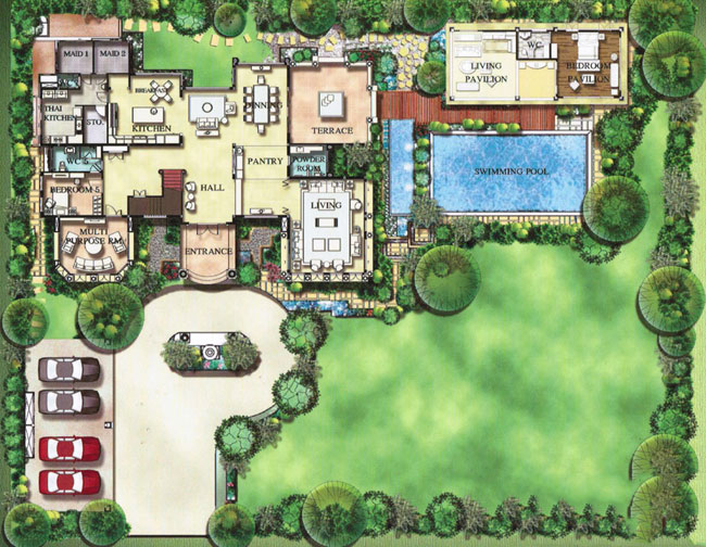 มองจากมุมศาลาพักผ่อนจะเห็นตัวบ้าน สระว่ายน้ำ และเรือนรับรอง