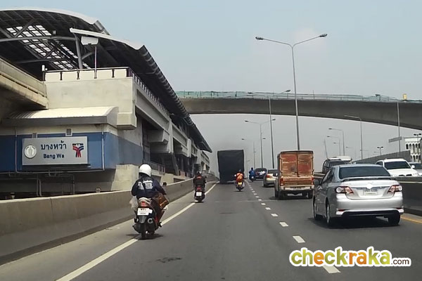 ขับตรงมาอีกจะผ่าน BTS สถานีตลาดพลู และสถานีวุฒากาศ ตรงจุดนี้จะเริ่มมีป้ายบอกทางไปถนนราชพฤกษ์แล้ว