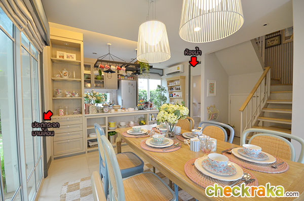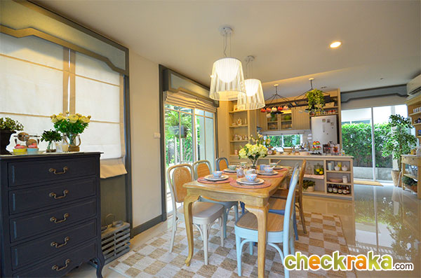 มองตรงๆ จะเจอกับพื้นที่ส่วนทานอาหาร สำหรับความสูงจากพื้นจรดเพดานของบ้านนี้อยู่ที่ 2.6 เมตรนะคะ