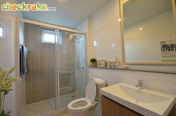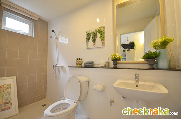 ภายในห้องอาบน้ำชั้น 2 แบ่งพื้นที่ส่วนเปียกออกจากพื้นที่ส่วนแห้งด้วยฉากกั้นอาบน้ำ ใต้กระจกมีการลดสเต็ปผนัง