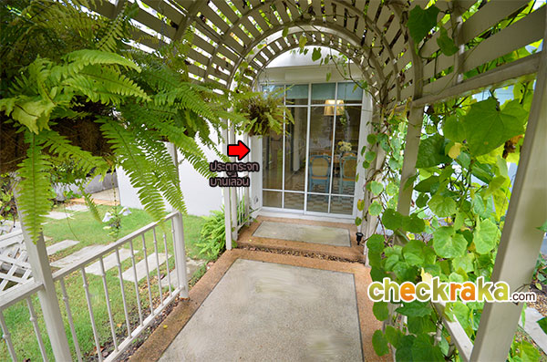 ช่วงหน้าบ้านมีพื้นที่จัดสวนที่ปูหญ้าไว้ให้เรียบร้อย ส่วนโถงทางเข้าบ้านปูด้วยพื้นกระเบื้อง