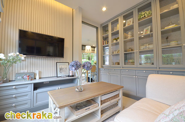 - แบบบ้านและตัววัสดุ : แบบบ้าน The Village ออกแบบบ้านด้วยสไตล์โคโลเนียล ที่ให้ความรู้สึกเหมือนบ้านในชนบทของชาวตะวันตก เด่นมากในเรื่องของความสวยและหน้าตาที่ต่างจากบ้านแฝดทั่วไป จากที่เดินสำรวจรอบบ้านและในบ้านถือว่าให้ความรู้สึกเหมือนอยู่บ้านเดี่ยว เพราะรอบตัวบ้านมีพื้นที่โล่งทุกด้าน และปรับการออกแบบขนาดของตัวบ้านให้ใหญ่ขึ้นกว่าบ้านของ The Village โครงการอื่น (อย่าง The Village บางนา กม. 8) สำหรับ การจัดวางพื้นที่ใช้สอยภายในตัวบ้านโดยเฉพาะชั้นล่างทำออกมาได้ดี ที่เด่นและน่าจะถูกใจหลายคนน่าจะเป็นห้องรับแขกที่เพิ่มความเป็นสัดส่วนด้วยการกั้นผนังแยกพื้นที่ออกจากส่วนรับประทานอาหารอย่างชัดเจน แถมที่เพดานยังมีการลดสเต็ปฝ้าเพดานและติดไฟแบบดาวน์ไลท์มาให้ตรงเพดานส่วนที่เล่นระดับนี้ ส่วนบ้านชั้น 2 ก็มีฟังก์ชันของห้องให้เยอะถึง 3 ห้องนอน และ 1 ห้องอาบน้ำ น่าจะเพียงพอกับครอบครัวขนาดกลาง ส่วนวัสดุที่โครงการใช้ส่วนใหญ่อยู่ในเกณฑ์มาตรฐาน อย่างประตูบานเลื่อน UPVC งานพื้นแกรนิตโต้ที่ชั้นล่าง และพื้นลามิเนตหนา 8 มิลลิเมตร ที่ชั้น 2 หรือการเลือกใช้สุขภัณฑ์ในห้องน้ำของ American standard ที่มีชื่อเสียง แบรนด์เป็นที่ยอมรับ ถึงแม้ว่าแบบของโถสุขภัณฑ์และฝักบัวจะธรรมดาไปสักหน่อย ถ้าทางโครงการขยายกันสาดหน้าบ้านให้มีขนาดใหญ่ขึ้น เพื่อที่จะได้ใช้งานกันฝนกันแดดได้ดีกว่านี้แล้วล่ะก็ จะถือว่าได้ว่าจัดวัสดุและออกแบบบ้านมาได้ผ่านเลยทีเดียวค่ะ