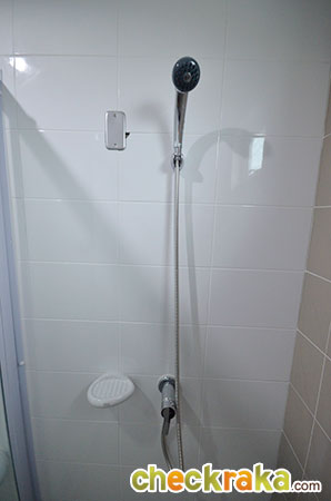 หน้าตาฝักบัวและที่วางสบู่เล็กๆ ในห้องอาบน้ำ ที่ผนังข้างฝักบัวมีจุดติดตั้งเครื่องทำน้ำอุ่นเตรียมไว้ให้เรียบร้อย