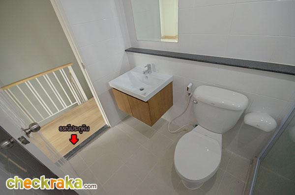 หน้าตาของอ่างล้างหน้า โถสุขภัณฑ์ และงานพื้นช่วงประตูทางเข้าที่ลดระดับพื้นห้องน้ำให้เตี้ยกว่า