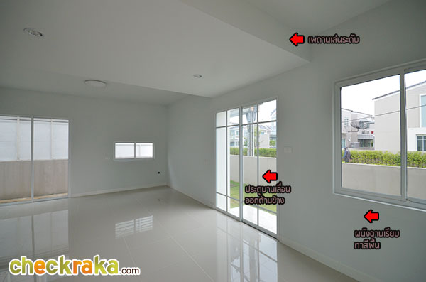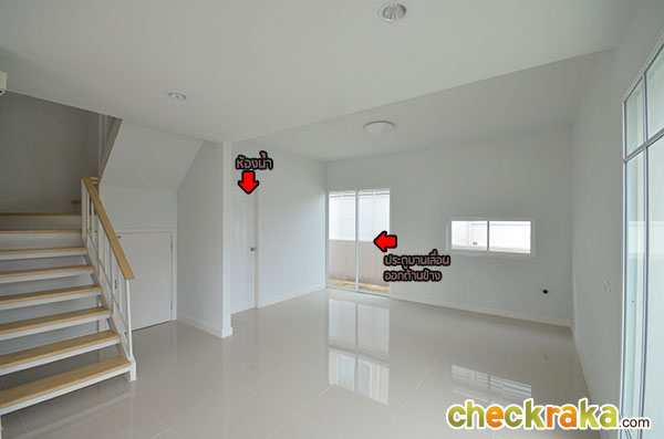 ภายในบ้านฝั่งขวามือมีกระจกบานเลื่อน และประตูบานเลื่อนไว้ให้เปิดออกไปที่สวนด้านข้างของตัวบ้าน