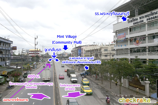 ถ้ามองลงมาจากสะพานลอยคนข้ามหันหน้าไปทางไปถนนรังสิต-ปทุมฯ (ออกเมือง) ออกไปจากด้านหน้าโครงการ 400 ม. ก็จะถึงจุดกลับรถ ฝั่งตรงข้ามก็จะเป็น Mint Village Community Mall และโรงเรียนพระหฤทัยนนทบุรีค่ะ
