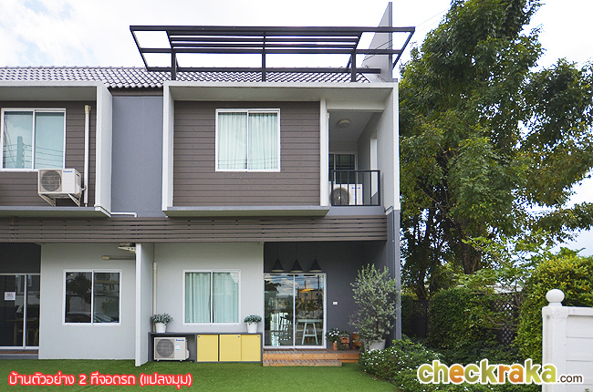 บ้านตัวอย่างโครงการเป็นบ้านแปลงมุมเช่นกัน ทำพื้นที่จอดรถเป็นสนามหญ้า