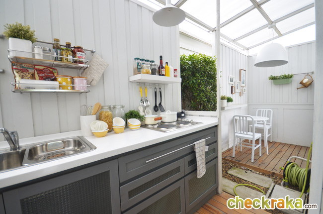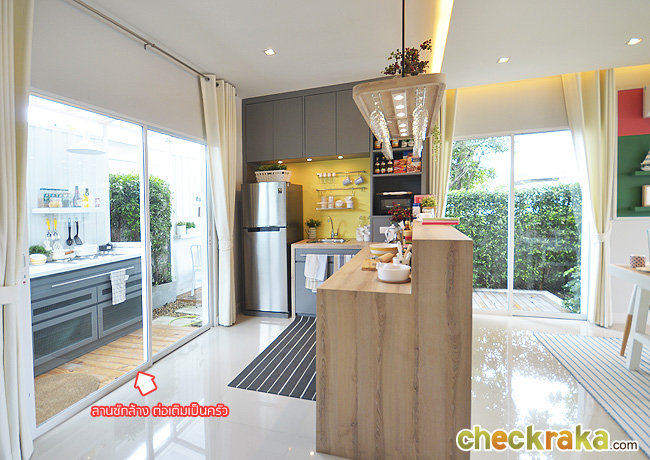 ส่วนครัวของแบบบ้านจอดรถ 2 คันนี้ได้ต่อเติมเพิ่มส่วนซักล้างให้เป็นครัวไทย ซึ่งหลายๆ บ้านก็ทำแบบนี้เช่นกัน
