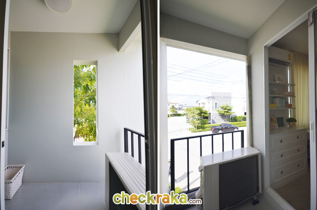 สำหรับบ้านส่งมอบ ก็สลับด้านกันหน่อย จะมีระเบียงเป็นแนวยาวอยู่ตรงส่วน Walk-in Closet ค่ะ