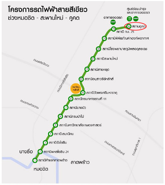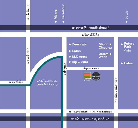 โครงการรถไฟฟ้าที่ใกล้โครงการนี้ที่สุดคือสายสีเขียวเข้ม (หมอชิต-สะพานใหม่) คาดว่าจะสามารถเปิดบริการได้ช่วงปี 2561 โดยสถานีที่ใกล้กับโครงการเดอะคัลเลอร์ส พรีเมียม รังสิต-ลำลูกกา คือ สถานีคูคต ซึ่งอยู่บริเวณด้านหน้าสถานีตำรวจภูธรคูคต อยู่ห่างจากโครงการประมาณ 11.2 กม. ซึ่งถือว่าไม่ใกล้มากนัก แต่ถ้าหากต้องการเดินทางเข้าตัวเมืองโดยหลีกเลี่ยงการใช้เส้นทางบนถนน ก็สามารถขับรถมาจอดได้ที่สถานีคูคตที่มีอาคารจอดรถรองรับอยู่ประมาณ 713 คัน ก็ถือเป็นอีกทางเลือกหนึ่งได้ค่ะ รถไฟฟ้าโครงการนี้มีระยะทางประมาณ 19 กม. มี 16 สถานีตามรูปด้านล่างนี้ค่ะ