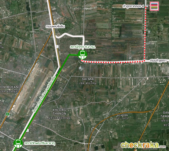 แผนที่เส้นทางจากถนนวิภาวดีรังสิตไปบรรจบที่ถนนลำลูกกา