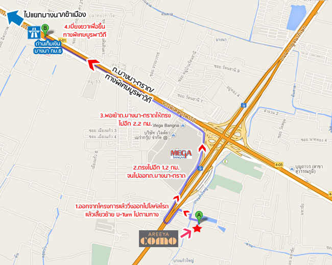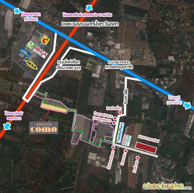 อารียา โคโม่ นั้นอยู่ใกล้ทางออกโครงการด้านถนนโลคัลโรดโดยอยู่ใกล้กับ Mega บางนา เพียง 650 ม. เท่านั้นค่ะ
