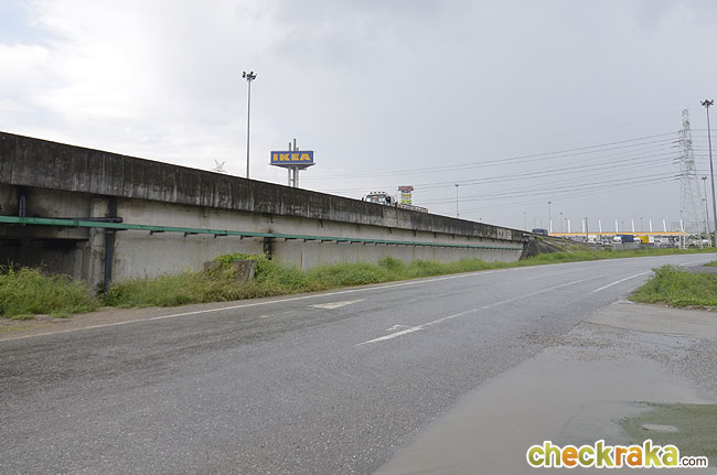 พอตรงมาประมาณ 13 กม. ผ่านถนนกิ่งแก้วจะเห็นป้ายสะพานกลับรถ ให้เราเตรียมกลับรถได้เลยค่ะ