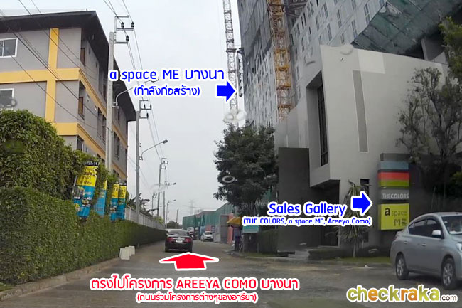 พอเลี้ยวเข้ามาแล้วตรงต้นซอยทางขวา คือ a space ME บางนา เป็นโครงการคอนโดของอารียาอีกโครงการหนึ่งที่กำลังก่อสร้างอยู่ค่ะ ส่วน Sales Gallery ก็ตั้งอยู่ทางขวามือเหมือนกัน ใช้เป็นสำนักงานขายให้กับหลายๆ แบรนด์ของอารียาในทำเลนี้เลย เช่น TheColors, a space ME, Areeya COMO ฯลฯ