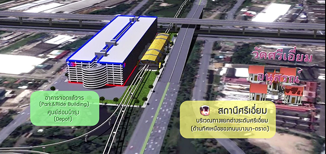 แผนที่แสดงเส้นทางเดินรถของรถไฟฟ้าสายสีเหลือง ลาดพร้าว-สำโรง สถานีที่ใกล้ที่สุดคือ สถานีศรีเอี่ยม (ห่างจากโครงการประมาณ 7.6 กม. ตั้งอยู่บริเวณจุดตัดระหว่างถนนบางนา-ตราด และถนนศรีนครินทร์)