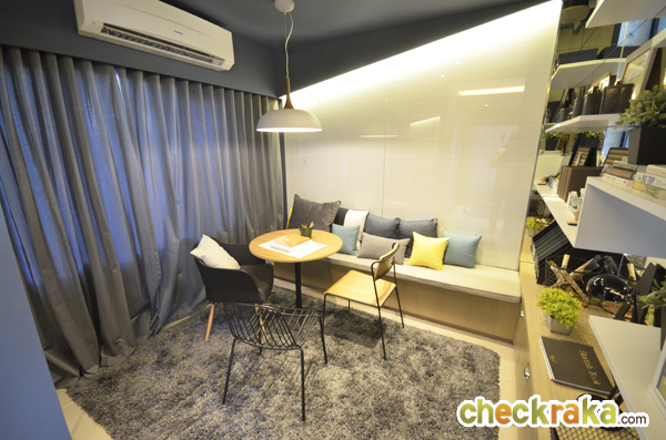 ถัดจาก Partition ที่กั้นจะเป็นพื้นที่แบบ Open Plan ความสูงจากพื้นถึงเพดาน 2.6 เมตร ส่วนหน้าจัดวางโซฟาพักผ่อน