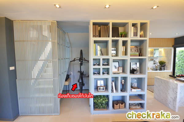 ก่อนจะขึ้นชั้น 2 มาดูส่วนห้องเก็บของใต้บันไดกันค่ะ มุมนี้ทางโครงการทำชั้นวางของขึ้นมา และ Built in