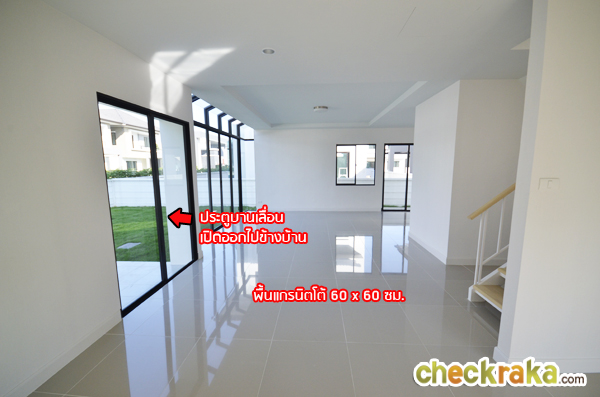 เข้ามาในตัวบ้านจะเห็นห้องโล่งไปจนสุดถึงด้านหลัง ไม่ได้กั้น Partition เหมือนบ้านตัวอย่างที่ตกแต่งแล้ว