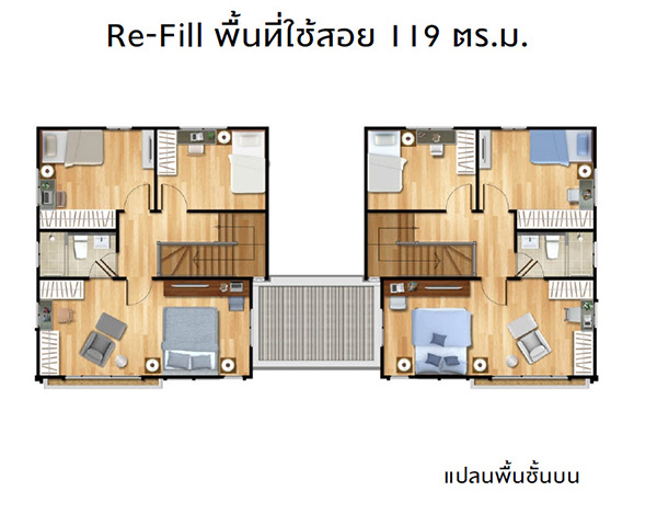 แปลนบ้านชั้นบนทำให้มองเห็นห้องเก็บของซึ่งเป็นส่วนเชื่อมต่อกันของบ้านแฝด 2 หลัง