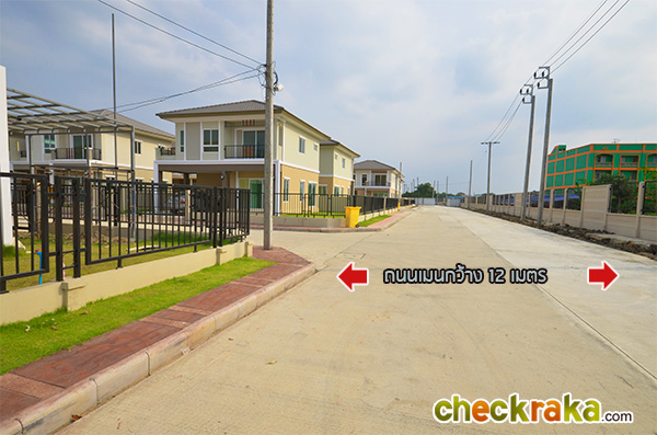 ข้างทางมีฟุตบาทยาวให้เดินได้สบายตั้งแต่ปากทางจนถึงซุ้มประตูทางเข้าโครงการ