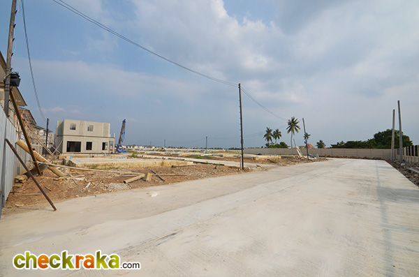 ผ่านซุ้มประตูเข้ามาซ้ายมือคือที่ตั้งของคลับเฮ้าส์ และสระว่ายน้ำในอนาคตของโครงการ แปลงบ้านแถวแรกที่เห็น