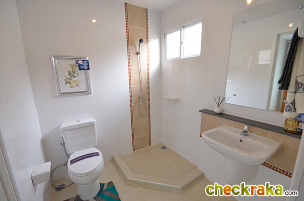 ต่อมาคือห้องอาบน้ำที่ชั้น 2 มีลักษณะเป็นห้องทรงลึกที่จัดวางพื้นที่เปียกไว้ด้านในติดผนัง พร้อมหน้าต่างบานเลื่อนเล็กไว้ช่วยระบายอากาศ และแยกส่วนพื้นที่เปียกออกจากพื้นที่แห้งด้วยหินก่อสูง (เตรียมพื้นที่เปียกไว้ให้ติดตั้งฉากกั้นอาบน้ำ)