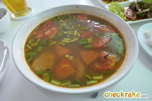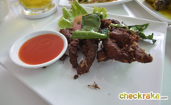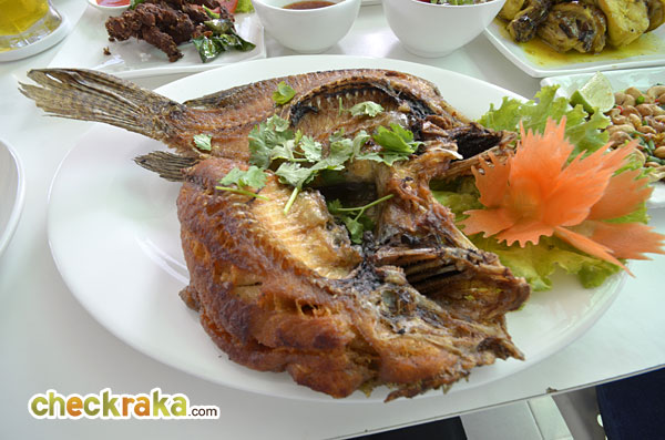 ปลานิลทอดน้ำปลา ที่นี่ใช้ปลาตัวใหญ่ ทอดกรอบนอกนุ่มใน เสิร์ฟพร้อมน้ำจิ้มยำ รสชาติเปรี้ยวหวานกำลังดี