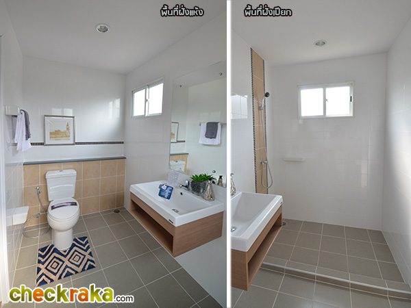 กลางห้องน้ำติดตั้งอ่างล้างหน้า ส่วนฝั่งขวาแยกส่วนพื้นที่เปียกด้วยหินก่อ