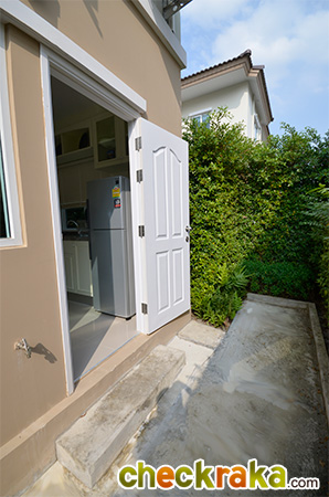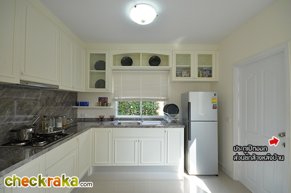 ภายในห้องครัวขนาดกำลังดี มีประตูให้เปิดไปยังหลังบ้านบริเวณพื้นที่ส่วนซักล้างของบ้าน TYPE นี้