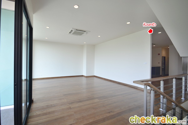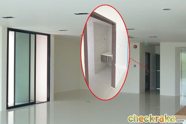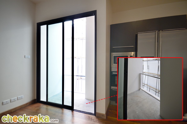 ด้านหลังที่มีผนังกั้น คือส่วนห้องครัวนี่เองค่ะ มีระเบียง และห้องน้ำ ครบครัน