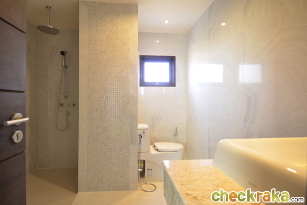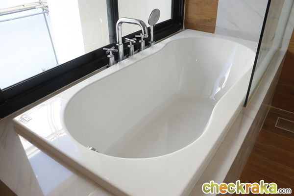 อ่างอาบน้ำมีแยกก๊อกน้ำอุ่นและน้ำเย็นและฝักบัว ส่วนพื้นเป็นกระเบื้องลายไม้ ที่เหมือนไม้จริงมากๆ