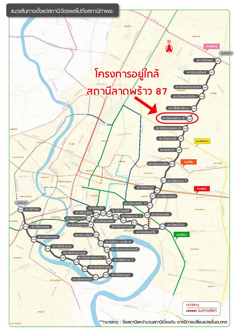สำหรับโครงการรถไฟฟ้าสายสีเทา ช่วงวัชรพล-ทองหล่อนั้นจะเริ่มต้นบริเวณสถานีวัชรพลวิ่งมาตามแนวถนนเลียบทางด่วน รามอินทรา ซึ่งสถานีที่ใกล้กับโครงการคาดว่าน่าจะเป็นสถานีลาดพร้าว 87 จากนั้นจะมีทิศทางวิ่งผ่านถนนพระราม9, ถนนเพชรบุรีจนถึงสถานีทองหล่อ