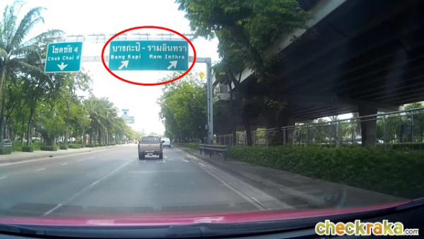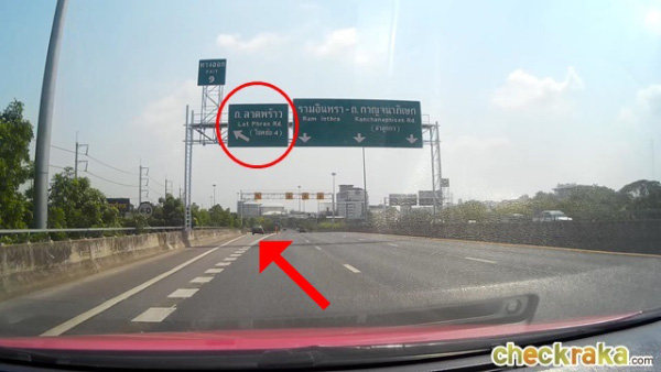 พอลงทางด่วนมาแล้วให้เตรียมขึ้นสะพานข้ามถนนลาดพร้าวโดยยึดป้าย บางกะปิ-รามอินทรา