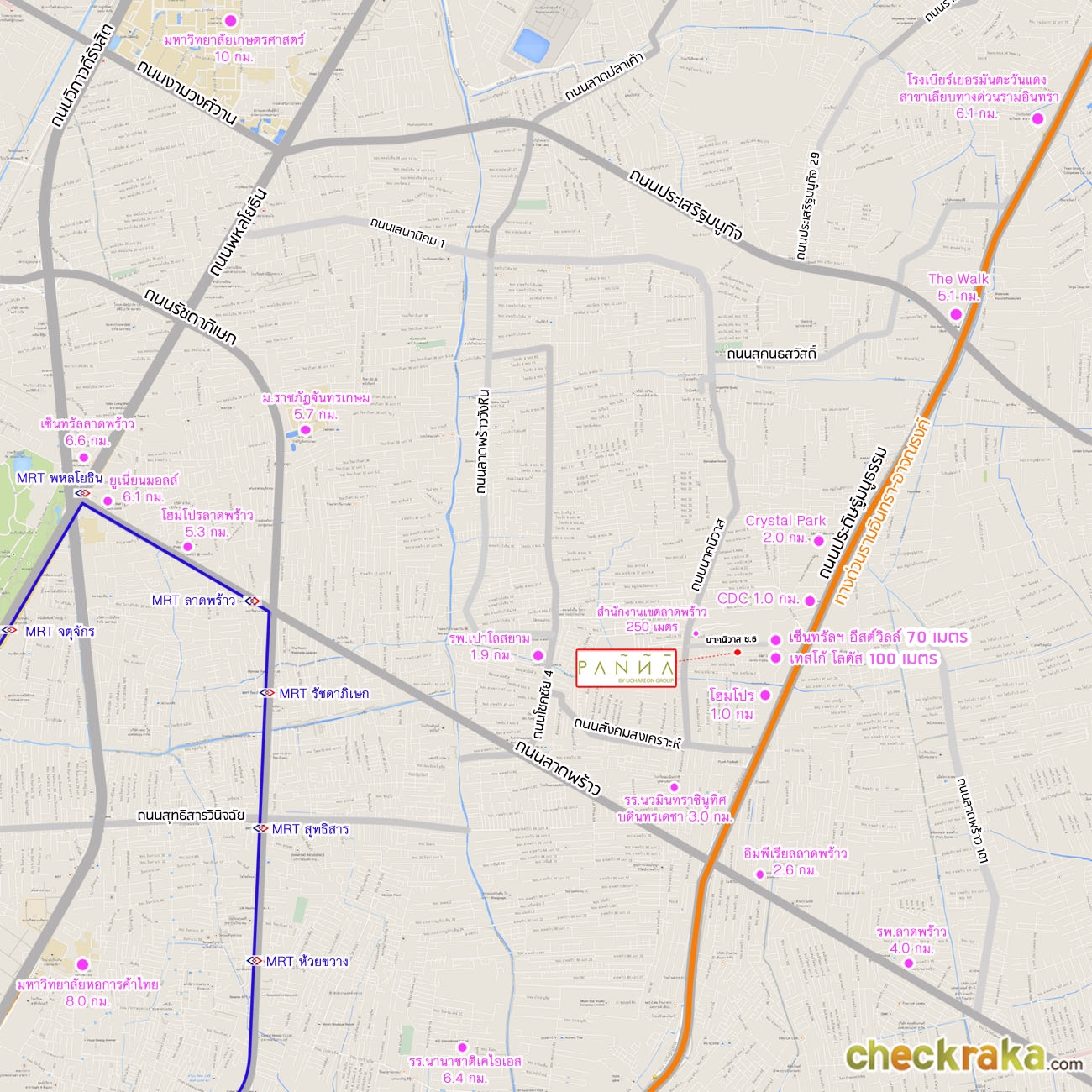 ภาพแผนที่โครงการแจกแจงให้เห็นระยะใกล้-ไกลของโครงการกับสถานที่ หรือ Landmark รอบๆ โครงการที่น่าสนใจตำแหน่ง GPS โดยประมาณของโครงการ = 13.802615, 100.609967