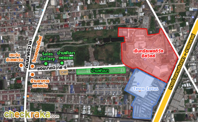 - ทำเลรอบโครงการ - สำหรับย่านรามอินทรานั้นถือว่าเป็นย่านธุรกิจสำคัญแห่งหนึ่งของชาวเมืองกรุงเทพฯ เพราะฉะนั้นแล้วในเรื่องของทำเลที่ตั้งของโครงการนี้ ถือว่าเป็นทำเลทองทีเดียวค่ะ และยังอยู่ติดกับเซ็นทรัลเฟสติวัล อีสต์วิลล์ ที่สร้างเสร็จเรียบร้อยแล้ว ซึ่งสามารถเข้าออกโครงการได้ทั้งจากเซ็นทรัลฯและซอยนาคนิวาส 6 เลยค่ะ และในส่วนที่ดินฝั่งตรงข้ามของโครงการยังเป็นที่ดินเปล่านั้น คาดว่าจะมีการพัฒนาในอนาคตด้วยเช่นกันค่ะ ส่วนอาหารการกินรอบๆ โครงการนั้น ถ้าออกไปด้านหน้าปากซอยนาคนิวาส 6 แล้วก็จะมีทั้งตลาดนัด, ร้านอาหาร, ร้านสะดวกซื้อ และซูเปอร์มาร์เก็ต ถือได้ว่าทำเลรอบโครงการถือว่าดีค่ะ