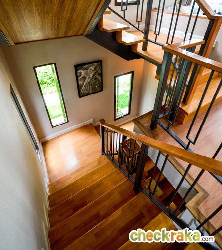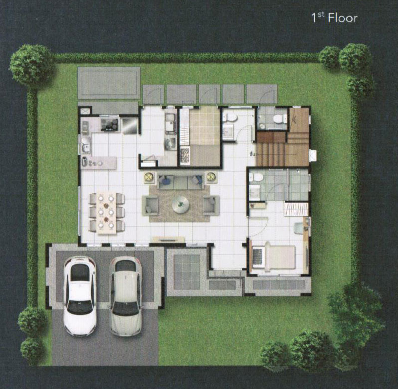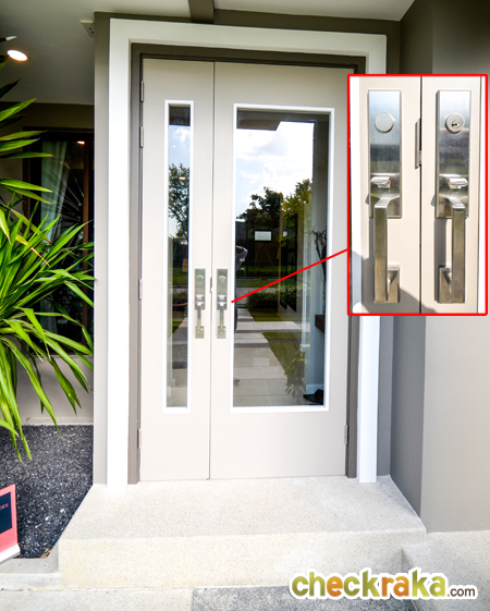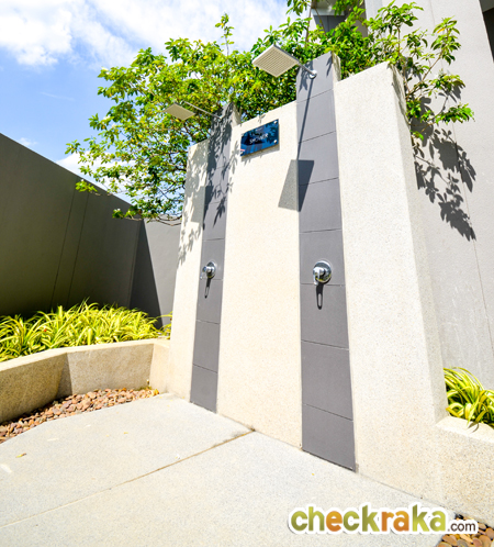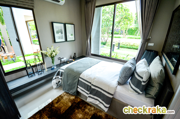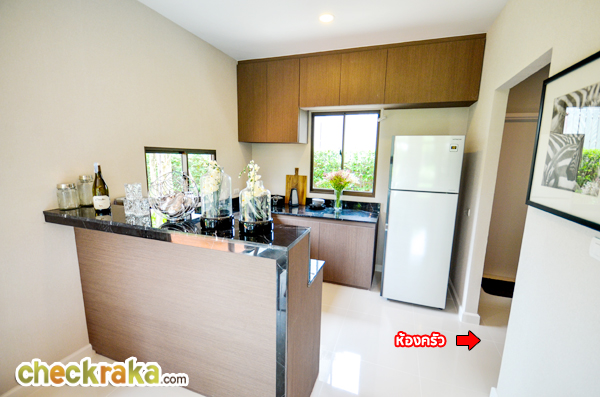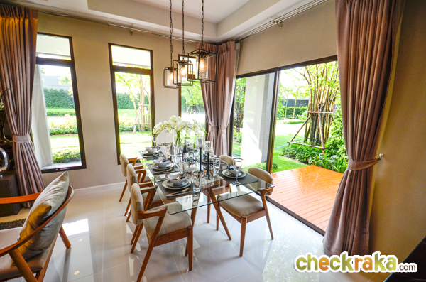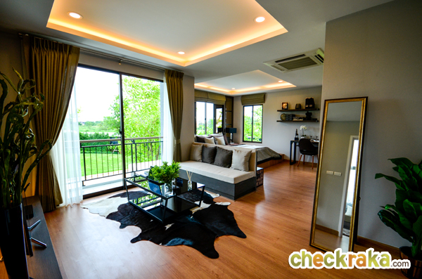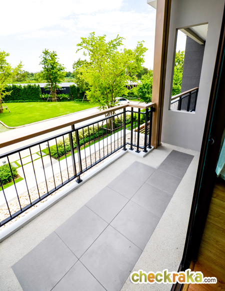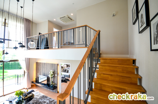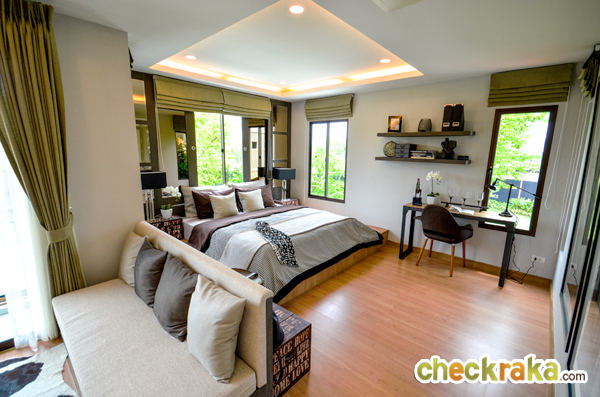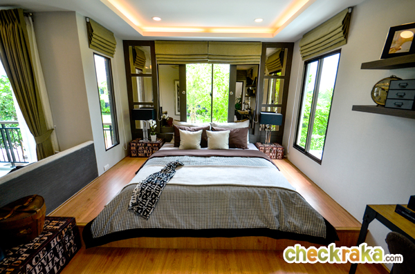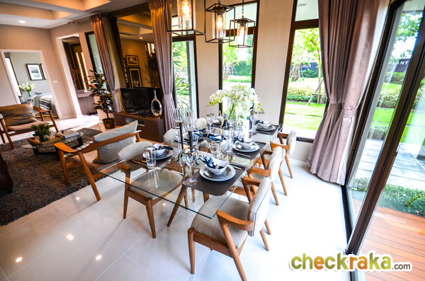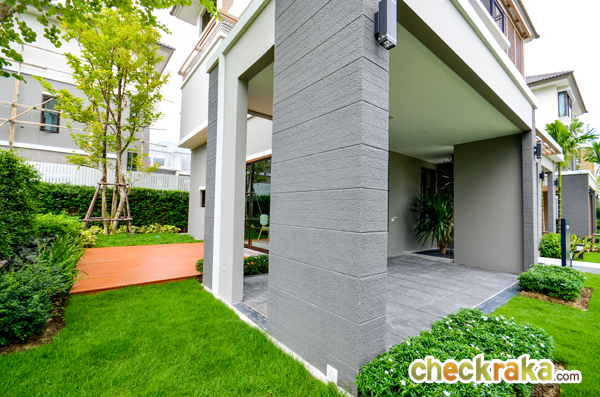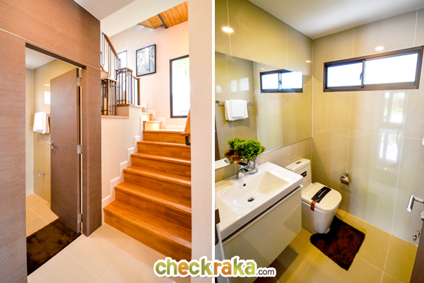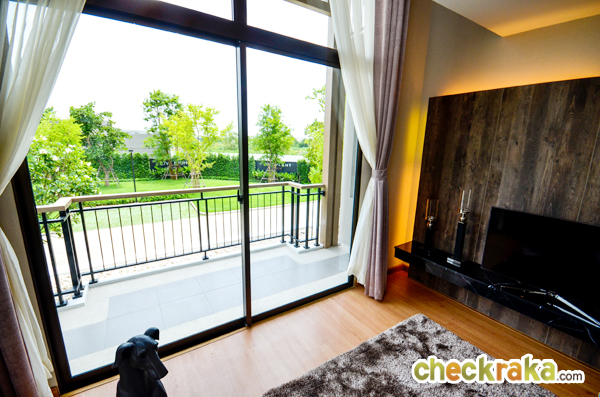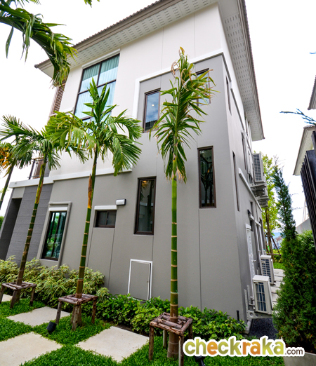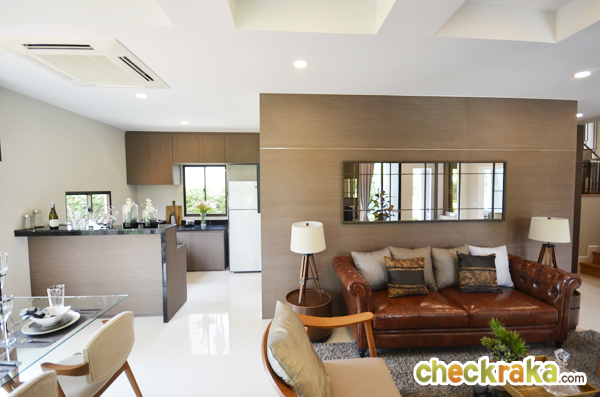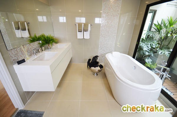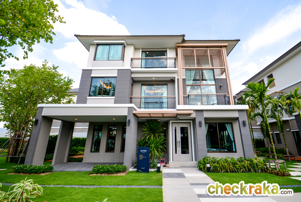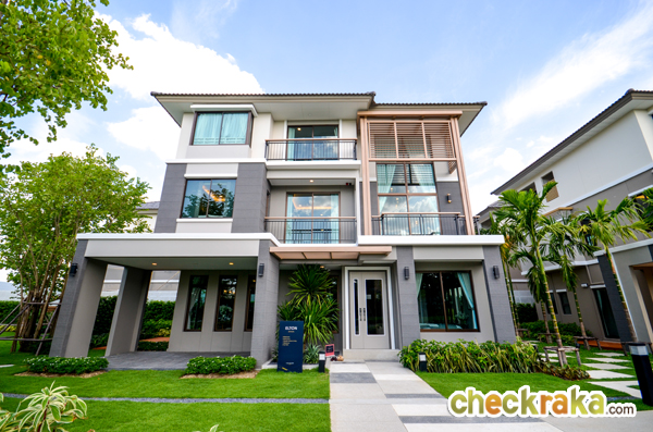 - แบบบ้านและวัสดุ - รูปแบบบ้าน และ Layout บ้าน โดยรวมค่อนข้างลงตัวทีเดียวสามารถรองรับสมาชิกในครอบครัวได้หลายคน จุดเด่นหลักๆ ก็มีอย่างเช่น บ้านโปร่งโล่งมีกระจกเยอะ และค่อนข้างมีฟังก์ชั่นใช้สอยที่คุ้มค่า ดีไซน์ตัวบ้านเรียบหรูไม่หวือหวา หรือโมเดิร์นจนเกินไป มีห้องน้ำในตัวทุกห้องนอน ภายในห้องนอนดีไซน์ได้ดีมีพื้นที่เหลือพอสมควร บ้านทั้งสองแบบมีห้องแม่บ้านพร้อมห้องน้ำแยกต่างหาก เป็นต้น วัสดุที่ให้เป็นประมาณนี้คือ มีติดสัญญาณกันขโมยมาให้ที่บานประตูหน้าต่างชั้นล่าง สำหรับหน้าต่างเป็นอลูมิเนียมอบสีน้ำตาลเข้ม กระจกเขียวตัดแสงทั้งหมด พื้นชั้นล่างเป็นกระเบื้องแกรนิตโต้ 60x60 ซม. พื้นชั้นบนลามิเนตหนา 12 มม. สุขภัณฑ์มีทั้ง American Standard, Mogen, Kholer และ Victor เป็นต้น บ้านที่ขายปกติ (แบบไม่มีโปรโมชั่นใดๆ) จะเป็นบ้านเปล่า และจะมีบางส่วนแตกต่างจากบ้านตัวอย่างพอสมควร ดังนั้น ก่อนซื้อลองสอบถามพนักงานขายเกี่ยวกับสิ่งที่จะให้มาพร้อมกับตัวบ้าน หรือวัสดุที่จะได้ในบ้านอีกครั้งนะคะ