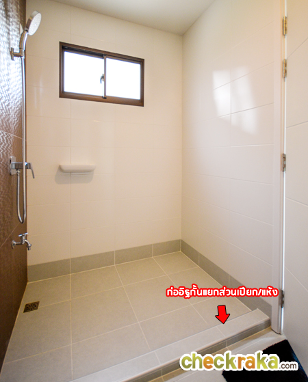 อีกฝั่งของห้องจะมีโถสุขภัณฑ์ และส่วนอาบน้ำพร้อมฝักบัวแบบ Rain Shower แยกส่วนเปียก/แห้งโดยใช้กำแพงกั้นเลยค่ะ ตรงส่วนอาบน้ำจะก่ออิฐยกสูงขึ้นเล็กน้อยกันน้ำไหลออกมาที่พื้นด้านนอก