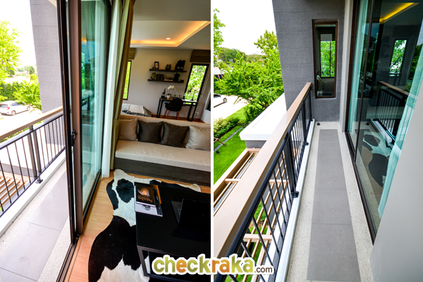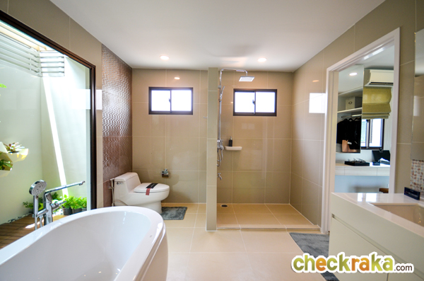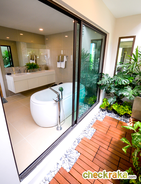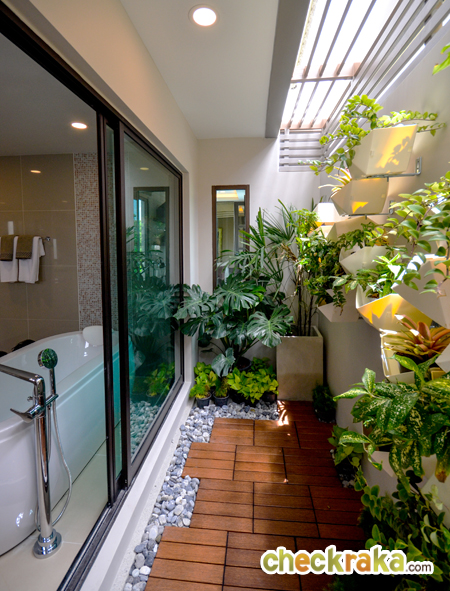 สำหรับจุดเด่นของห้องน้ำห้องนี้คือมี ระเบียงชมสวนมาให้ พื้นที่ตรงนี้เจ้าของบ้านอาจจะตกแต่งเป็นสวนต้นไม้ขนาดเล็ก