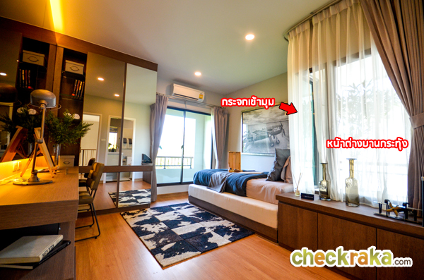 อีกฝั่งหนึ่งเป็นกระจกเข้ามุมหากเปิดม่านออกหมดจะช่วยเพิ่มความสว่างให้กับห้อง และยังรู้สึกกว้างขึ้น