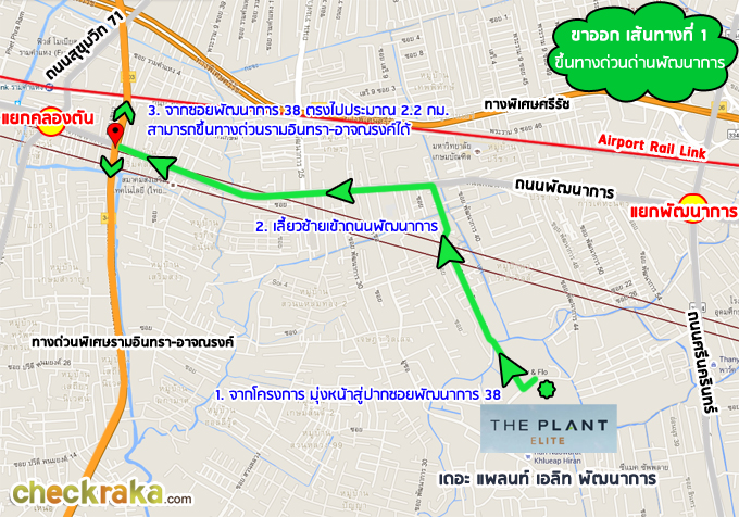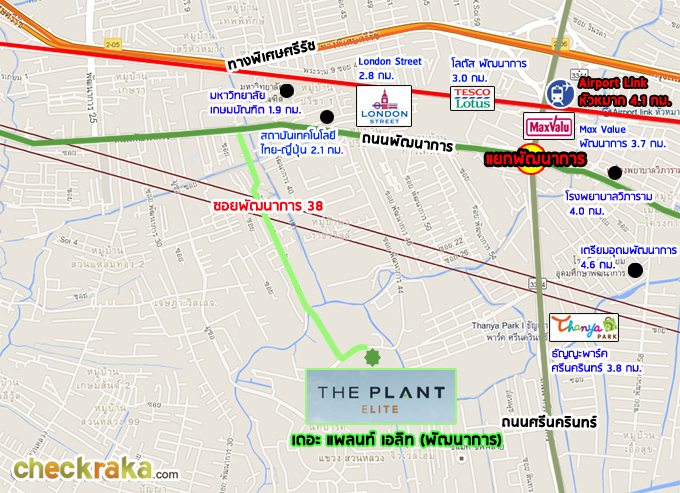 - ทำเลที่ตั้ง - โครงการเดอะแพลนท์ เอลิท พัฒนาการ ตั้งอยู่ในซอยพัฒนาการ 38 อยู่ใน Pruksa Avenue เป็นพื้นที่แหล่งรวมหมู่บ้านของพฤกษา ซึ่งถือได้ว่าไม่ไกลจากตัวเมือง และเดินทางไปแหล่งเดินเล่น หรือช้อปปิ้ง อย่างเช่นเอกมัย ทองหล่อ หรือศรีนครินทร์ได้ค่อนข้างสะดวกทีเดียว นอกจากนี้ ตัวถนนพัฒนาการเองก็สามารถทะลุไปได้หลายที่ เช่น อ่อนนุช พระราม 9 หรือรามคำแหง รวมถึงไปขึ้นทางด่วนได้ในระยะไม่ไกล แต่ตัวโครงการนั้นไม่ได้อยู่ใกล้ถนนใหญ่พัฒนาการ (ห่างจากถนนใหญ่ประมาณ 1.6 กิโลเมตร) และในซอยนี้จะมีแหล่งชุมชมมุสลิมอยู่บ้าง ดังนั้น จึงมีมัสยิด และอาจได้ยินเสียงเรียกสวด (Call to prayer หรือ Adhan) เวลาละหมาดได้เป็นครั้งคราว