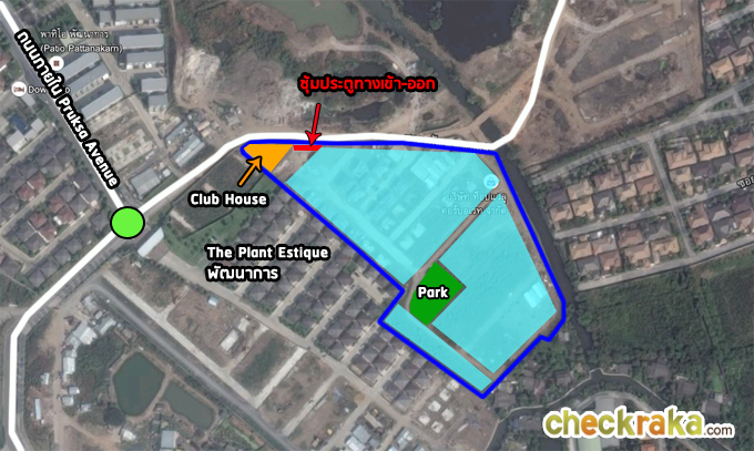 - ตัวโครงการโดยรวมและส่วนกลาง - ตัวโครงการตั้งอยู่ใน Pruksa Avenue ถือได้ว่าร่มรื่นน่าอยู่มากๆ เพราะในบริเวณนี้มีแต่หมู่บ้านพฤกษา ซุ้มประตูทางเข้าโครงการมีขนาดใหญ่เป็นเอกลักษณ์ สำหรับส่วนที่อยู่อาศัยอยู่ลึกเข้าไปด้านใน ทำให้ลดปัญหาด้านเสียงและฝุ่นควันได้มาก มีเพียงบางหลังเท่านั้นที่ติดถนนแต่ไม่เป็นปัญหามากนักเพราะถนนภายในโซนนี้ไม่ได้มีการใช้งานบ่อย การเข้า-ออกโครงการมีทางเดียวทำให้โครงการมีความเป็นส่วนตัว ส่วนพื้นที่รอบข้างโดยรอบ ฝั่งซ้ายคือโครงการ The Plant Estique พัฒนาการ ฝั่งขวาคือ โครงการ The Connect พัฒนาการ 38 ที่เหลือเป็นที่ดินส่วนบุคคล และที่อยู่อาศัยแนวราบ ทำให้ตัวโครงการมีความสงบ บรรยากาศในโครงการดูร่มรื่น ไม่แออัด สบายตาด้วยพื้นที่สีเขียว เพราะบ้านแต่ละซอยมีจำนวนหลังไม่มาก ประกอบกับถนนภายในโครงการกว้างขวางตามมาตรฐาน และยังทะลุถึงกันทุกซอย ไม่มีซอยตัน รั้วรอบโครงการมีความสูง 3 เมตร สำหรับส่วนกลางของโครงการนั้น มีขนาดพอเหมาะ แต่ก็มีมาให้ครบเลยคือคลับเฮ้าส์ สระว่ายน้ำ เครื่องออกกำลังกาย และสวนสาธารณะขนาด ซึ่งโดยรวมก็เหมาะสมกับจำนวนบ้านซึ่งมีเพียง 87 หลังภายในโครงการ
