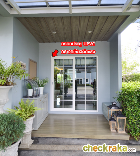 มาดูทางเข้าหลักด้านหน้าบ้านกันเลยค่ะ กรอบประตู UPVC ของ Winsor พร้อมกระจกเขียวตัดแสงทั้งหลัง