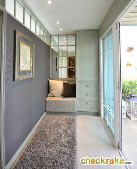 Walk-in Closet พร้อมโต๊ะเครื่องแป้ง พื้นที่ตรงนี้ถือว่ากว้างขวางทีเดียว และมีหน้าต่างบานเลื่อนมาให้ด้วย