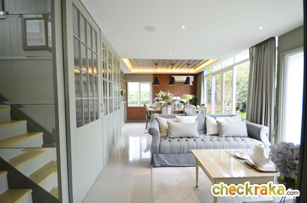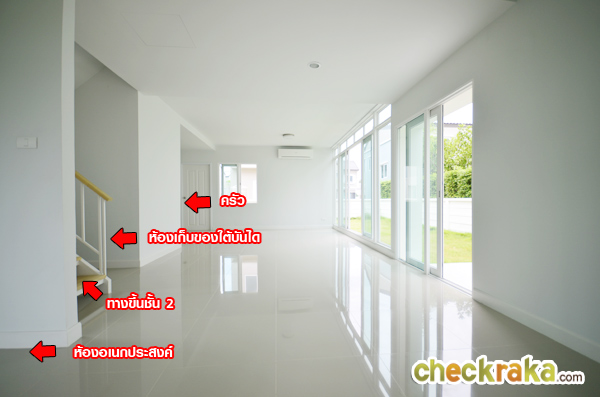 เข้ามาในตัวบ้านจะเห็นห้องโล่งไปจนสุดถึงด้านหลัง ไม่ได้กั้น Partition เหมือนบ้านตัวอย่างที่ตกแต่งแล้ว