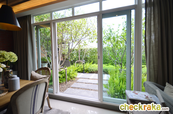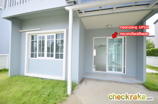 ประตู UPVC กันน้ำกันฝน ส่วนหน้าต่างบานเลื่อนด้านข้างเปิดรับแสงธรรมชาติเข้ามาภายในตัวบ้าน